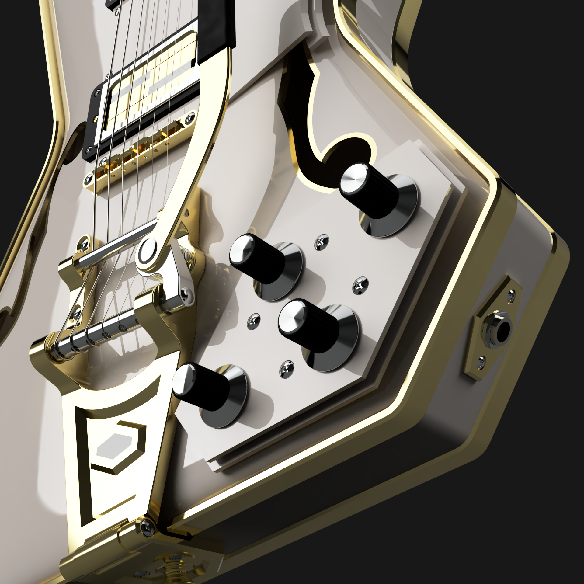 I love playing and working on electric guitars so it only makes sense that I've designed a few of my own! Unfortunately I haven't had the opportunity to build any of my designs in real life, but that doesn't you mean you can't look at some of my beatutiful renderings and technical drawings! Click any of the images below to see more.