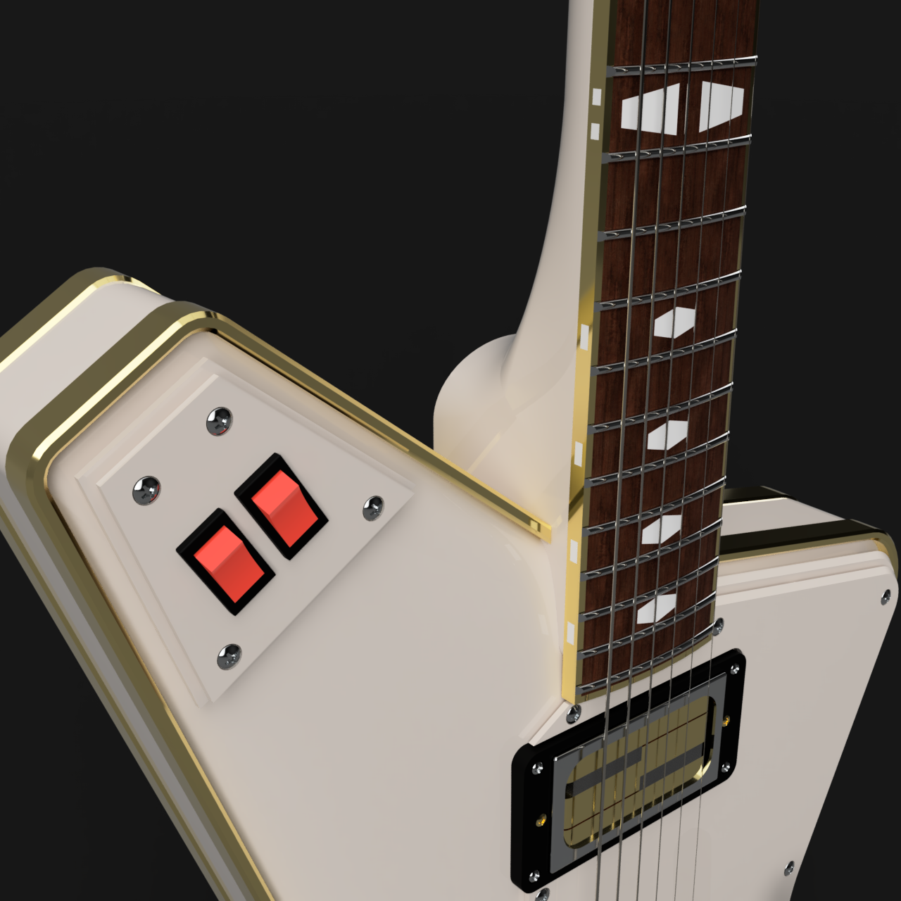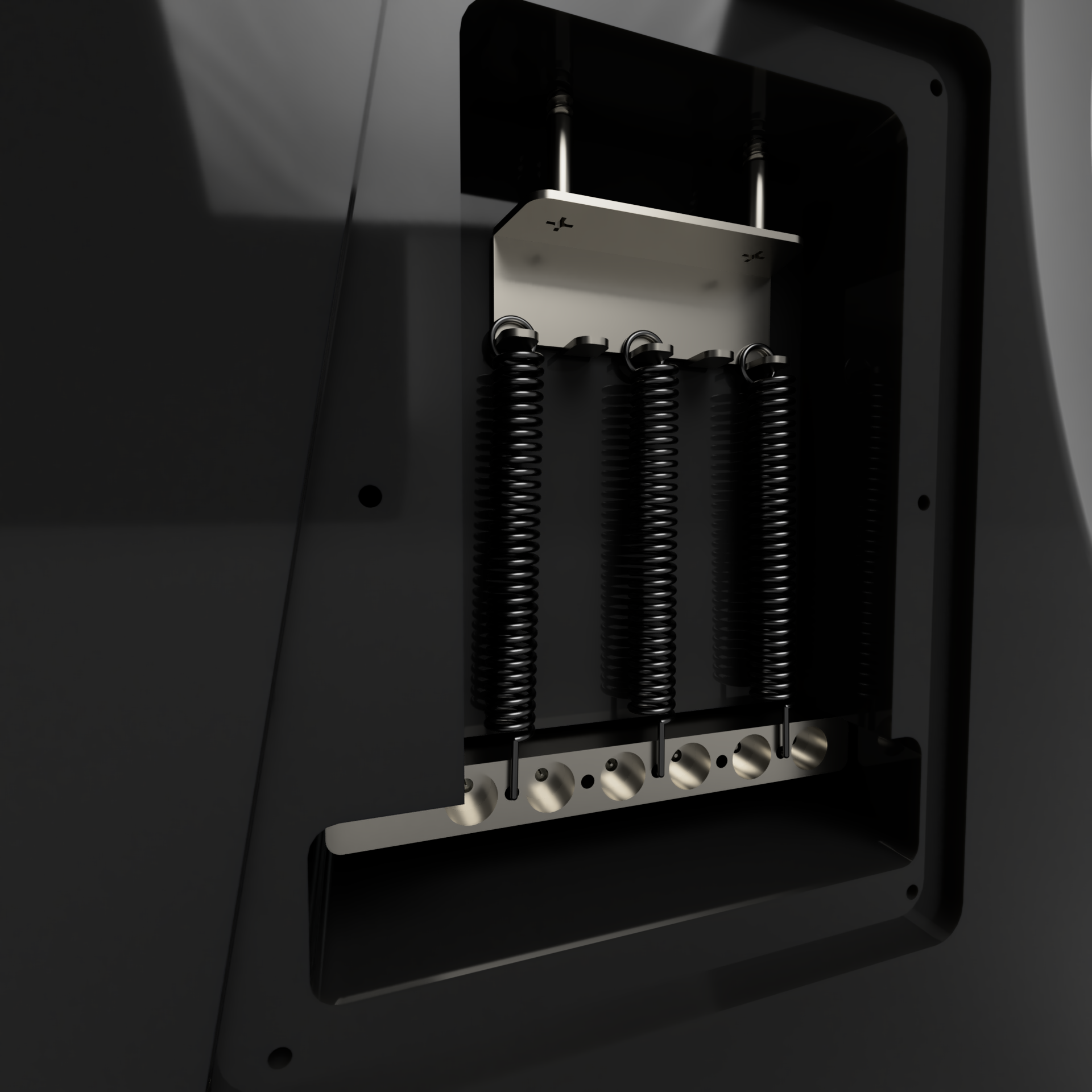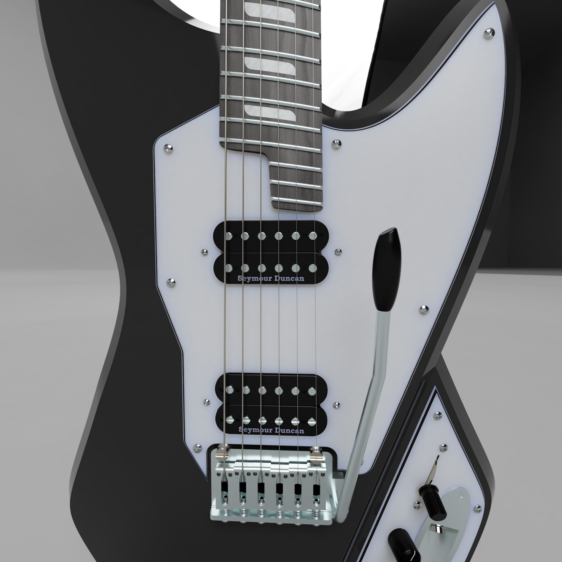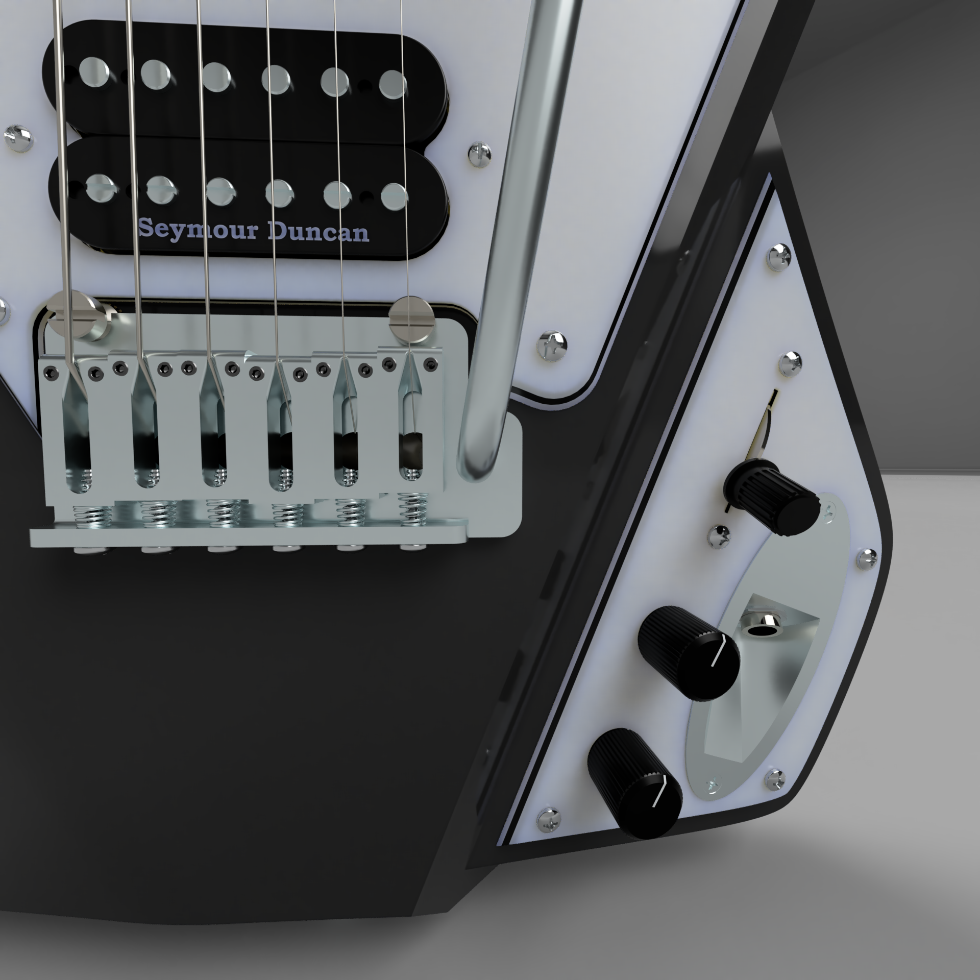 This is an electric guitar I designed to cater to heavier genres like metal and grunge. It includes features like beefy humbuckers (JB SH-4 bridge, Jazz SH-2 neck), a strat-style tremolo, and a fanned fretboard appropriate for drop tuning. The control panel is recessed to avoid accidentally hitting knobs or the pickup switch while playing aggressively -- a common issue present with many S-style guitars.