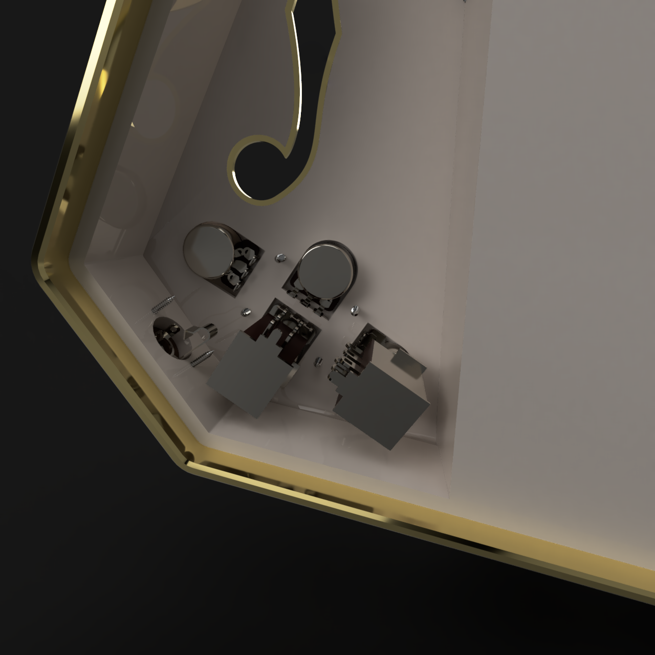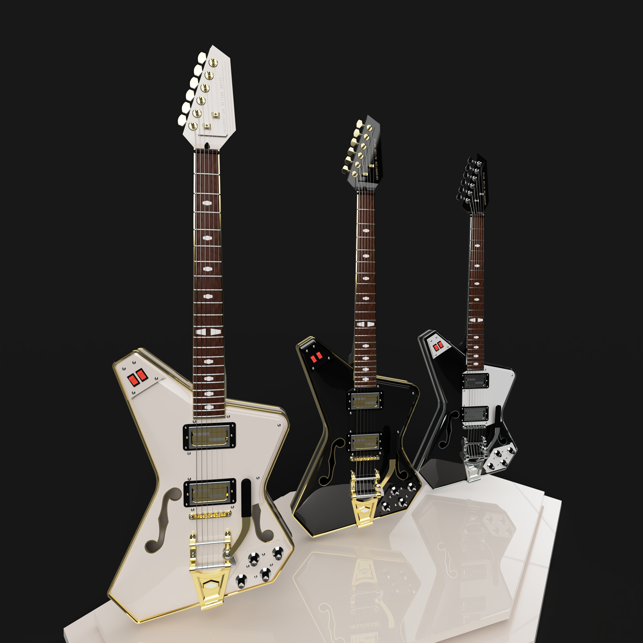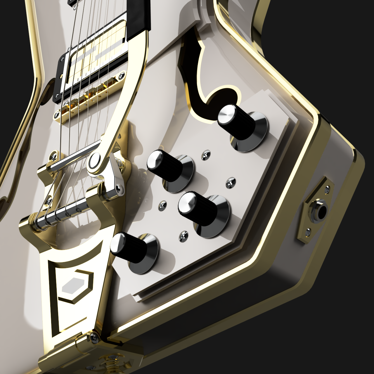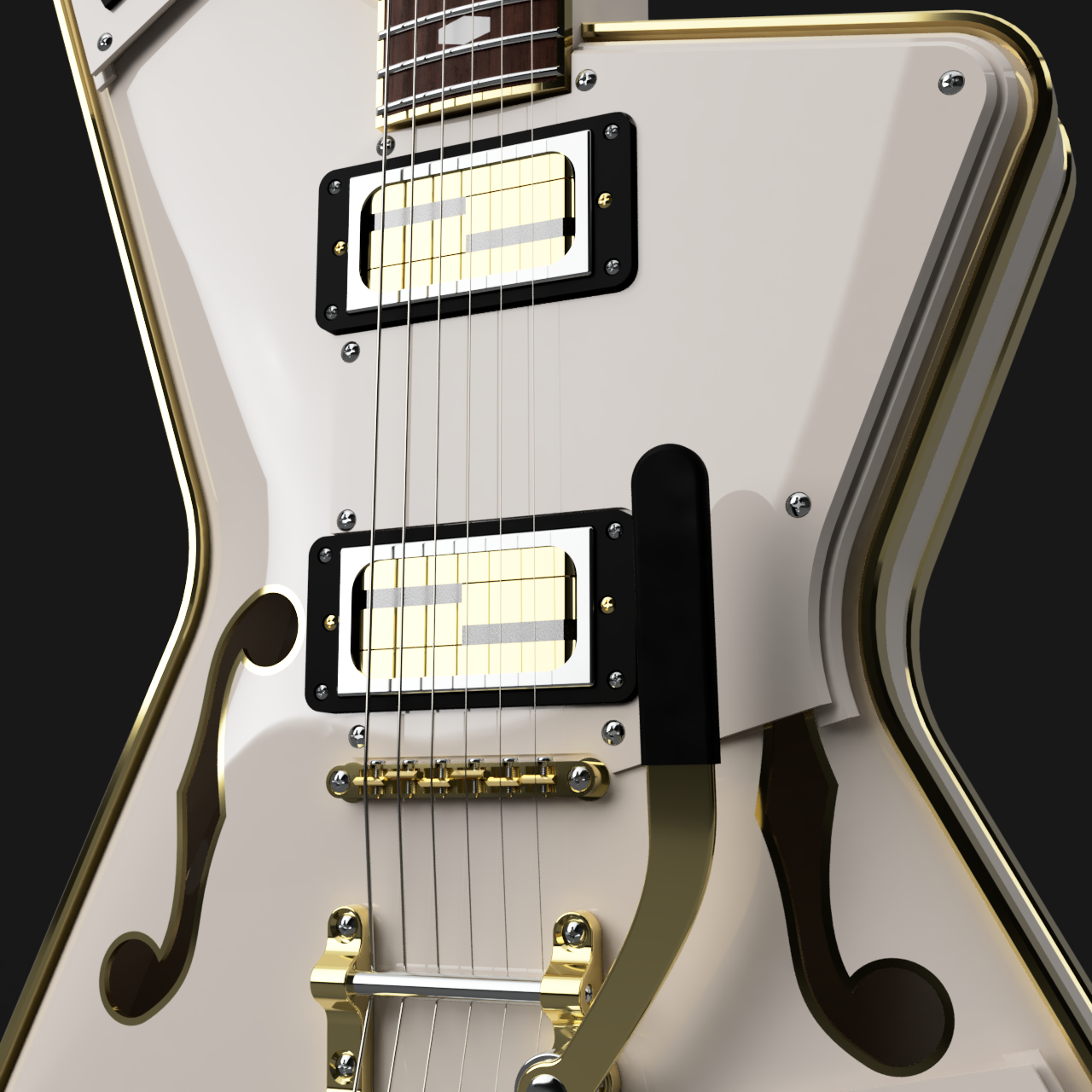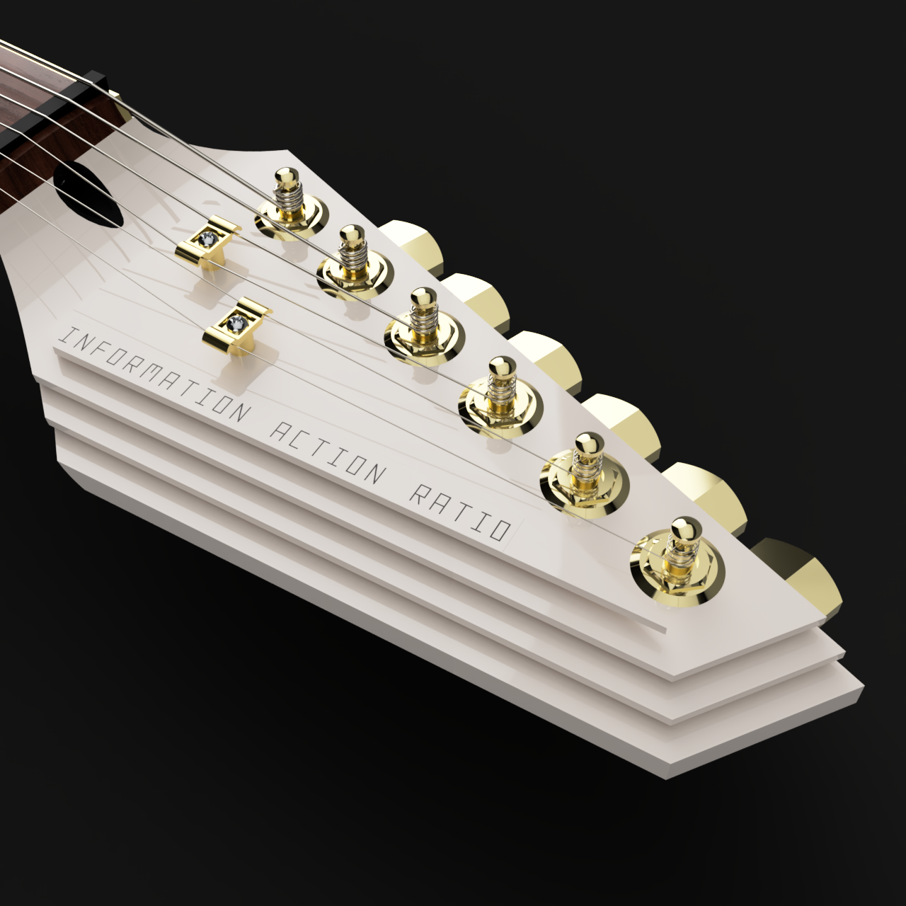 This semi-hollow body guitar is inspired by the aesthetic of the Artic Monkeys' album Tranquility Base Hotel and Casino (album cover art included for reference). Its name references the song Four Out of Five, which mentions a taqueria named the Information-Action Ratio in a hotel on the moon (very sci-fi). Includes Lace Jazz 251 Humbuckers, push/pull split coil tone pots for each pickup, and a Bigsby-style tremolo system.