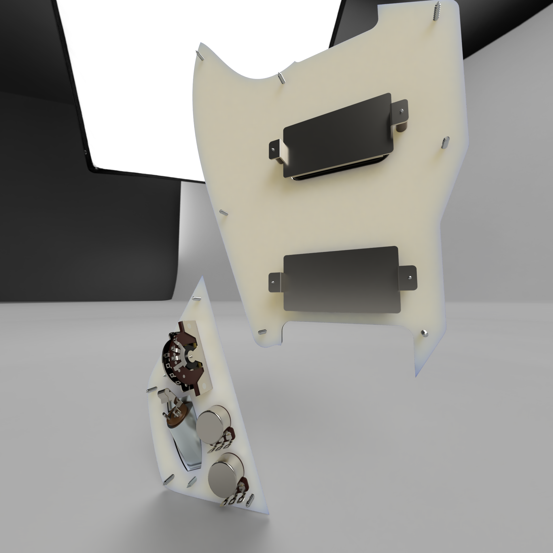 This is an electric guitar I designed to cater to heavier genres like metal and grunge. It includes features like beefy humbuckers (JB SH-4 bridge, Jazz SH-2 neck), a strat-style tremolo, and a fanned fretboard appropriate for drop tuning. The control panel is recessed to avoid accidentally hitting knobs or the pickup switch while playing aggressively -- a common issue present with many S-style guitars.