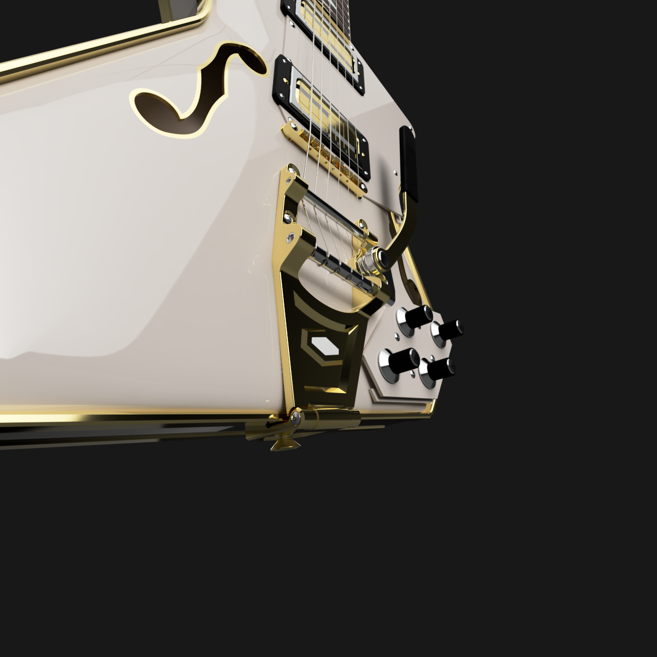 This semi-hollow body guitar is inspired by the aesthetic of the Artic Monkeys' album Tranquility Base Hotel and Casino (album cover art included for reference). Its name references the song Four Out of Five, which mentions a taqueria named the Information-Action Ratio in a hotel on the moon (very sci-fi). Includes Lace Jazz 251 Humbuckers, push/pull split coil tone pots for each pickup, and a Bigsby-style tremolo system.
